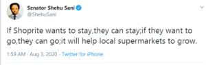 In a tweet he shared, Sani stated that Shoprite’s exit will help local supermarkets to grow. He tweeted;